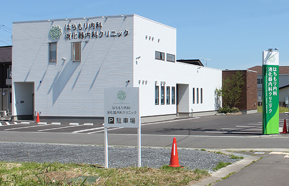 向かって左側の白い建物が当院です。植栽の見える側の正面入口からお入りください。