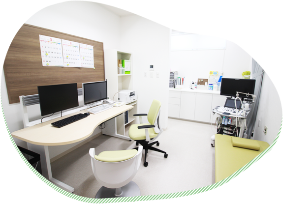 患者様に落ち着いた雰囲気で診察を受けていただくため、また、症状をわかりやすく説明するために茶色を基調としたデスク、二つのモニターを設置しております。
