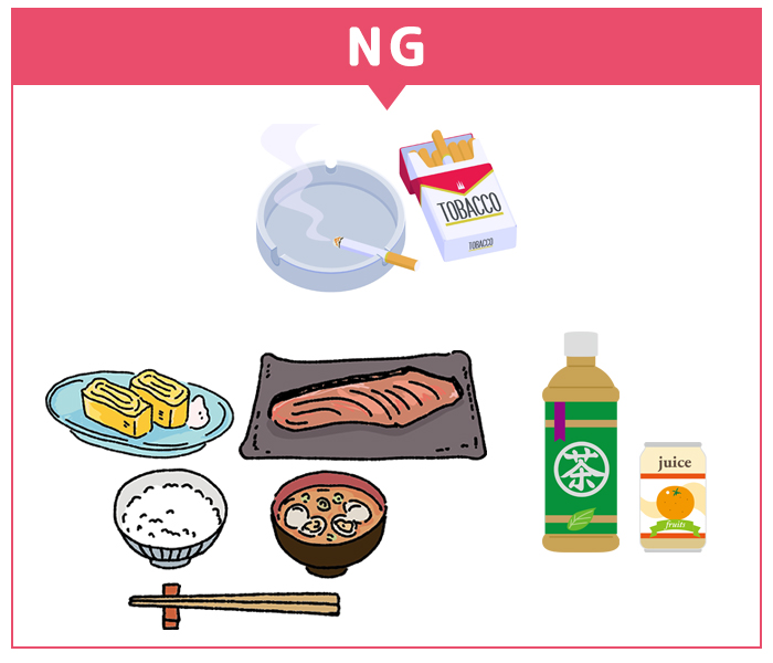 - 食事、お茶やコーヒーなどの飲み物、たばこ、薬等はとらないでください。