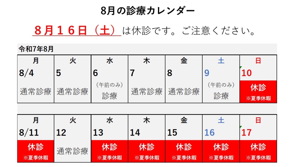 2025.06.198月の診療カレンダー(夏期休暇にご注意ください) 8月13日(水)~8月17日(日)は、診療をお休みとさせていただきます。※8月16日(土)は休診です。お休み前後の診療は大変混みあいますので、ご注意ください。 記事一覧に戻る